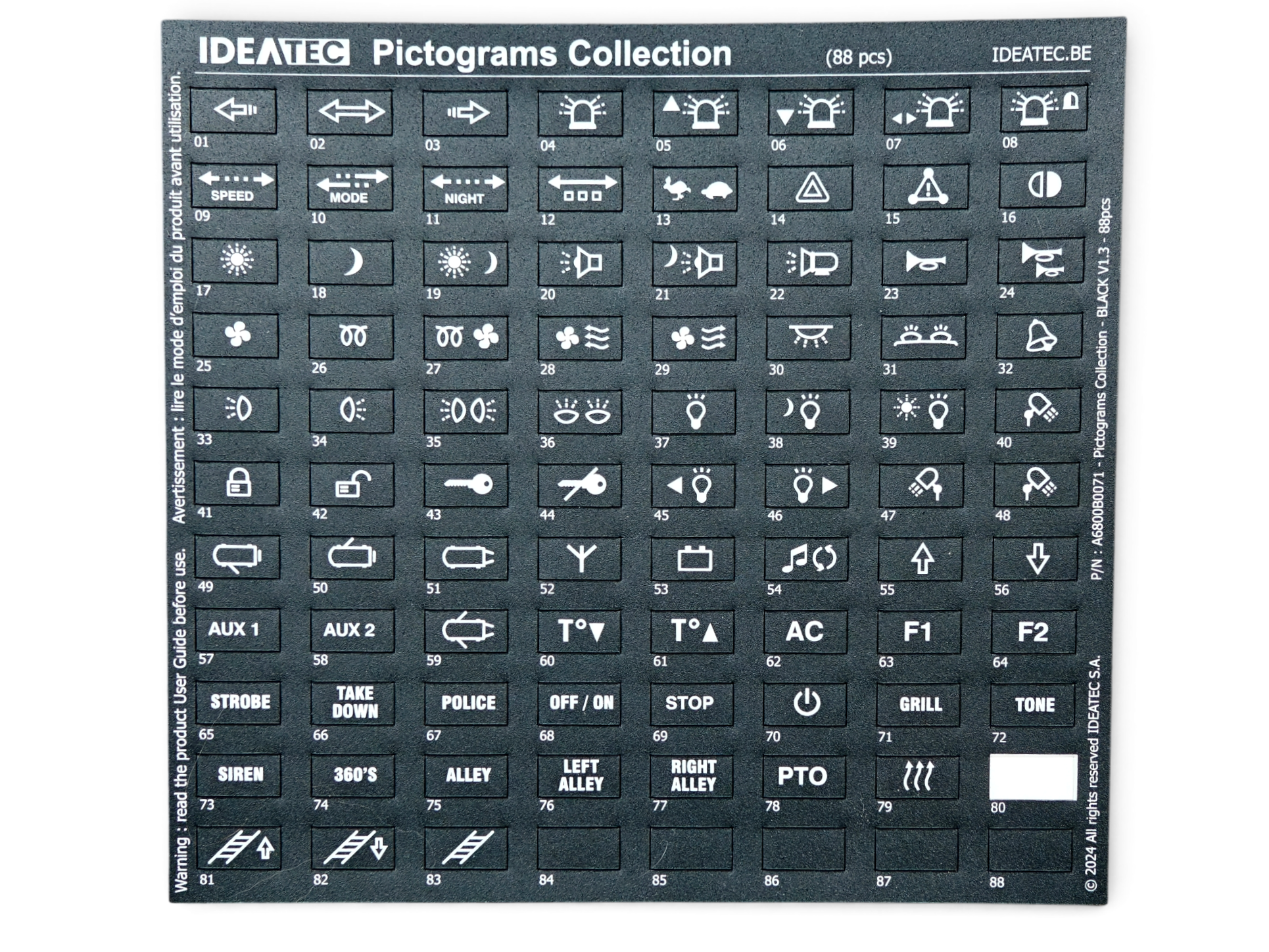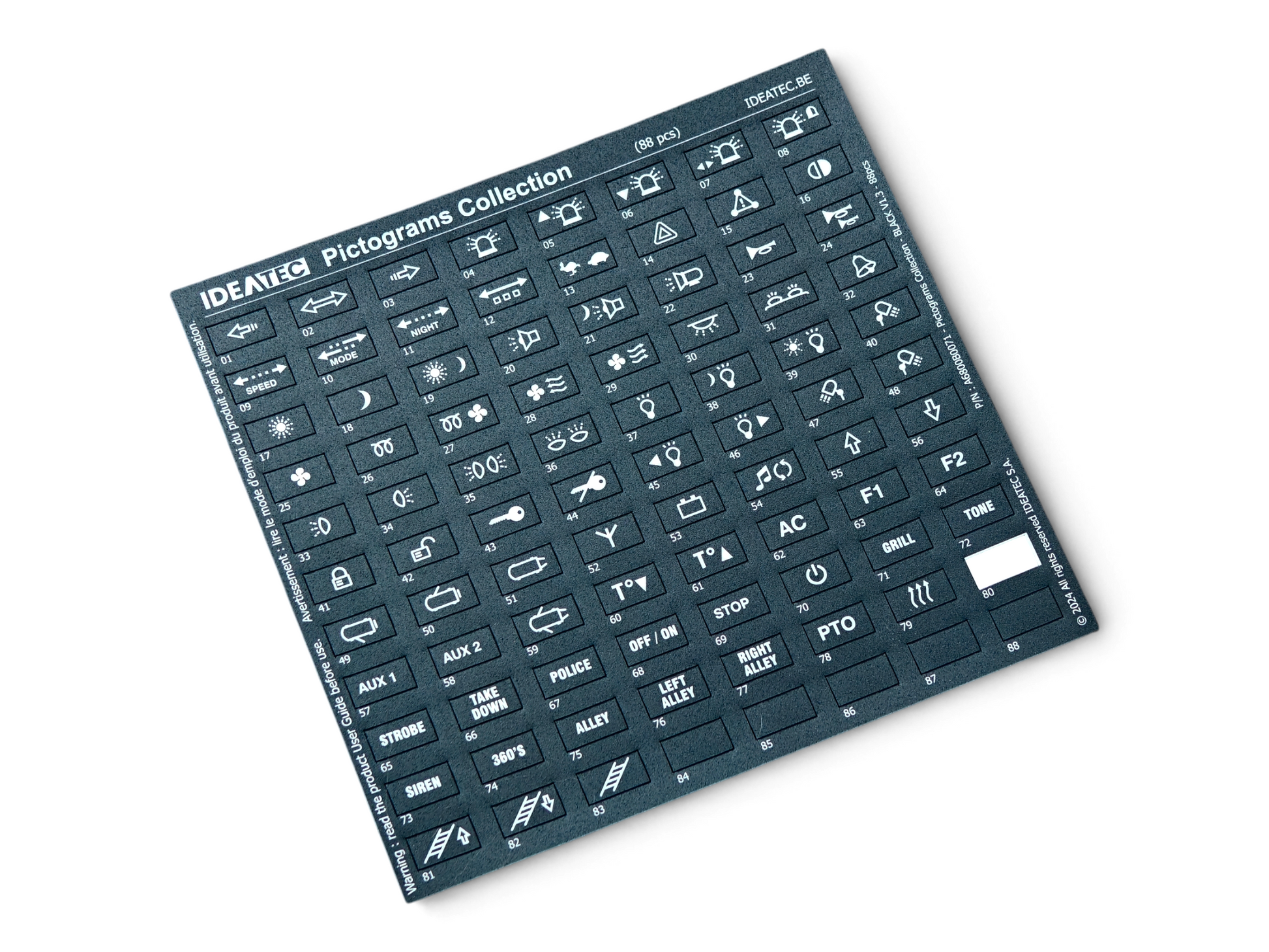 Stickervel met zwarte iconen voor Ideatec voertuig bediensystemen. Geschikt voor onderstaande bediensystemen: